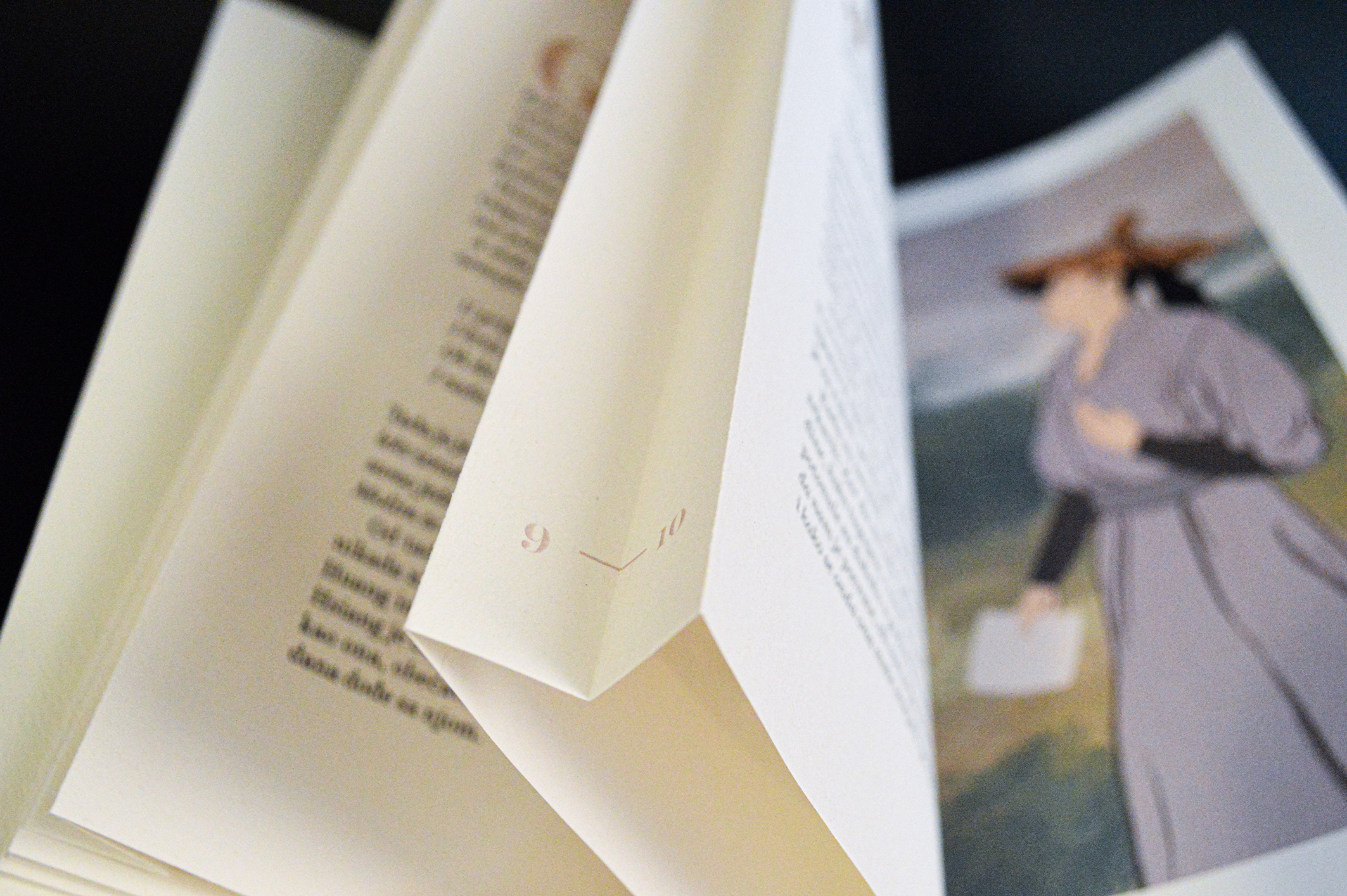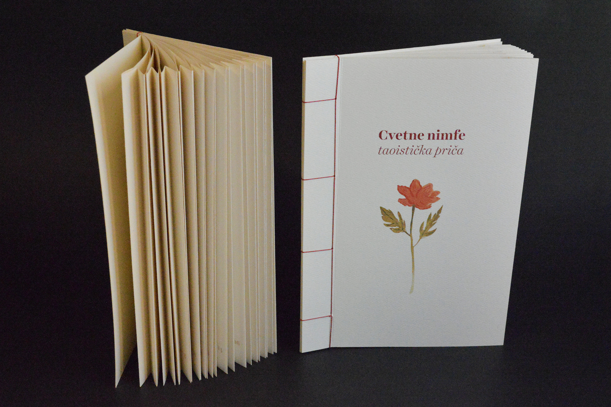 „Floral Nymphs” book is interactive, consists of eleven pages, eight pages of text and the same number of illustrations, three of which come to life using augmented reality (AR) technology. The book is bound with a Japanese binding and there are small tabs on each page where the pagination is hidden. All facing pages contain illustration and text, with one exception where a larger illustration spans both facing pages. Several key moments, disappearances and emergences occur during this story. These motives were clearly inspiring for me to work in augmented reality technology. I wanted to use AR and the medium of the book to show something more than the illustrations themselves and to evoke the atmosphere they carry.